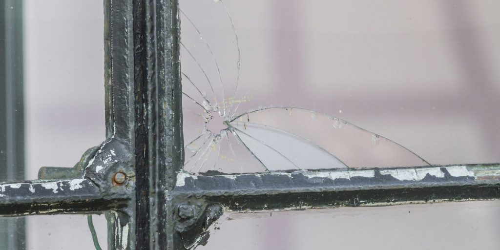 How do you remove broken glass from a window frame?